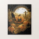 Noite de Halloween e a lua são cheios sobre a mancha de abóbora, onde um espantalho assiste sobre o distante campo de milho e um misterioso gato negro persegue um rato. Por Paxdomino