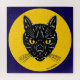 Uma ilustração retrô do rosto de um gato preto com olhos amarelos aparece em um círculo semelhante à lua nesta arte original apropriada para o Halloween de Richard H. Fay.