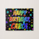 Este design de quebra-cabeça de quebra-cabeça animado e divertido, com tema de aniversário, exibe a mensagem "HAPPY BIRTHDAY, CAROL" com os personagens que têm um espectro colorido de arco-íris inspirado em gradação, além de um campo empolgante de estrelas como padrão de fundo. Um quebra-cabeça vibrante como este pode ser uma maneira divertida de enviar uma mensagem de saudação de aniversário a alguém chamado Carol. [~Z0000468]