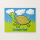Ilustração animada de uma tartaruga feliz sobre grama verde sob céu azul com nuvens brancas. Custom Text.