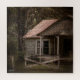 Uma casa de madeira envelhecida, com telhado enferrujado, senta-se em meio à folhagem verde, apresentando uma atmosfera nostálgica e misteriosa com tons naturais de decaimento e renovação acentuados pelo seu cenário rural.