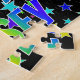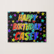 Este design de quebra-cabeça, animado e com tema de aniversário, exibe a mensagem "HAPPY BIRTHDAY, CASEY" com os personagens que têm um espectro colorido do arco-íris inspirado em um padrão de gradação, além de uma estrela vibrante molda o plano de fundo. Um quebra-cabeça vibrante como este pode ser uma maneira divertida de enviar desejos de aniversário a alguém chamado Casey. [~Z0000468]