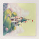 Esta ilustração esbranquiçada apresenta um castelo mágico rodeado por um jardim verde, com nuvens suaves flutuando sobre as escadas e enrolando até à entrada do castelo. A cena do sonho convida-vos a imaginarem entrar num cheio de fadas de aventura e maravilha.