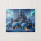 Jigsaw puzzle of an impressive castle made of igloos and stone, in a winter landscape of snow and pine trees. Magical aurora lights play in the evenfall sky, bathing the mountains and valley in a surreal atmosphere of heavenly colors. Amidst the misty strands of cold and snow, the stronghold castle known as "Winter Fire" stands. It is the last bastion of civilization and warmth before a vast expanse of frozen tundras, snowcapped mountains, and haunted forests open themselves to the wanderlust of the willing traveler... This artwork was created with ImageFX and upscaled with Leonardo.ai. Additional editing was done offline by me.
