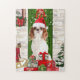 Cavalier King Dog sentado do lado de fora de casa decorada com coroa de Natal, árvore de Natal é uma ideia perfeita de presente de Natal para amantes de cachorros.