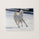 Um cavalo branco espirituoso que galopa aproximadamente em um pasto nevado.