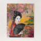 Esta quebra-cabeça apresenta um japonês bonito com uma cena de uma casa japonesa, uma japonesa vestindo roupas tradicionais e flores de Sakura.