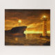Cena náutica com farol num pôr do sol laranja do céu. frontiernow.com