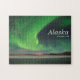 O Aurora Borealis espanta sobre o rio Knik no Alasca. Também tem texto que diz "Alaska Cortain Call" por Ted Raynor