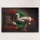 Foto de Donald Trump sentado em uma cadeira de couro marrom vestindo uma fantasia de elfo de Natal