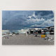 Esta quebra-cabeça de serra mostra minha fotografia tirada em maio, da praia do Pescador em Hythe Kent England. As nuvens estavam se erguendo e a chuva podia ser vista caindo na Baía de DymChurch.