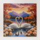 Crie um incrível quebra-cabeça "Cisnes Brancos" apresentando uma cena serena e romântica de dois cisnes brancos graciosos formando um coração em um lago calmo. Essa imagem pitoresca captura a beleza da folhagem de outono com tons vibrantes de laranja, vermelho e dourado, complementada pela reflexão dos cisnes e da paisagem deslumbrante. Árvores altas e perenes ao redor e majestosas montanhas iluminadas pelo sol contra um nascer ou pôr do sol colorido aumentam a atmosfera tranquila. Flores laranja brilhantes florescem na frente, tornando esse quebra-cabeça uma representação idílica de paz, beleza natural e harmonia romântica perfeita para entusiastas de quebra-cabeças e amantes da natureza.