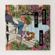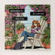 Uma ilustração divertida de um gibi de uma mulher sentada na cadeira de grama em seu pátio, com seu gato, uma xícara de café ou chá e cercada por clematis roxos e plantas penduradas.