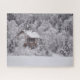 Quebra-cabeça coberto de neve da foto das árvores da cabine do inverno