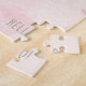 quebra-cabeça com um coelho de coelho de cor aquosa a espreitar ao redor da esquina e um fundo de cor de água rosa e cinza. Altere a palavra "Olá" para outra palavra ou frase.