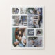 Mostre a sua família ou memórias de casamento com esta bela quebra-cabeça de colagem fotográfica em branco com um quadrado azul-cinza atrás do seu monograma. O design inclui espaço para 7 fotografias: 2 grandes horizontais, 2 médias verticais e 3 menores quadrados no estilo Instagram. Adicione sua letra monográfica em cursivo. Os modelos simples facilitam a personalização. "Personalize mais" para fazer alterações mais detalhadas.