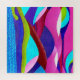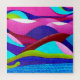 Uma paisagem abstrato colorida de colinas e um oceano de cores rosa, roxo, azul, verde e ciano.