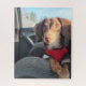 Kio é um Dachshund sentado num banco de carro esperando para ir à loja.