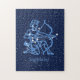 Quebra-cabeça com o símbolo do zodíaco do Sagitário em azul-prata suave, sobreposto com as estrelas da constelação, contra um fundo do céu estrelado formando do azul-da-meia-noite ao preto.