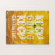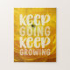 Aproveite horas de diversão com este bonito quebra-cabeça com uma fotografia em close de uma flor amarela de um botão e a citação positiva "continue crescendo".