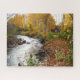 Um riacho corta seu caminho pela floresta no outono do ano. Um riacho aguarda a chegada das águas a algum lugar à distância.