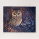 Este trabalho de arte retrata uma coruja azul em uma ramificação de fundo azul, no estilo de preto escuro e âmbar claro, colorida à mão, narrativa colorida de tela, porcelana, uso vibrante de luz e sombra, conto de fadas.