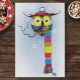 Coruja linda e muito redonda sentada num galho vestindo seu cachecol e chapéu multicoloridos. Flocos de neve caindo por toda parte.