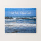 Um quebra-cabeça da lembrança com uma fotografia tomada na rocha do selo na costa de Oregon do Oceano Pacífico azul bonito, das ondas que deixam de funcionar na areia e de rochas irregulares. Personalize adicionando seu nome ao texto customizável que diz: Sele a rocha, costa de Oregon. Aperfeiçoe para amantes da praia.