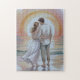 A lovely puzzle of a loving couple on the beach at sunset conveying a romantic and peaceful emotion