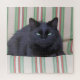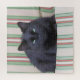 Gato negro sentado aconchego numa cadeira de relva listrada. As almofadas da cadeira são colocadas verticalmente em bege, verde, vermelho e branco. Gato tem olhos verdes.