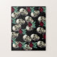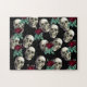 O branco que sorriem os crânios e as rosas vermelhas com folhas verdes contra um fundo preto fazem a isto um design impressionante e original.