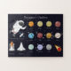 Espaço exterior bonito e atraente tematizou o Quebra-cabeça de Jigsen para o aspirante a astronauta que pode desenvolver fascínio pelos planetas, foguetes e tudo o que está lá fora no universo. Personalize com seu próprio texto ou nome de sua criança e deixe que ele saiba mais sobre o cosmos enquanto se diverte com atividades recreativas.