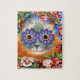 Este quebra-cabeça bonito da foto com lata apresenta o mundo maravilhoso, lunático do artista inglês famoso Louis Wain do gato e seria o presente perfeito para amantes do gato e proprietários do gato. Um composto de duas de pinturas famosas de Wains, o quebra-cabeça caracteriza uma pintura da cara de um gato bonito, colorido com flor roxa as pestanas dadas forma e de um casaco luxúria do gengibre contra um fundo de flores do verão. Podia este ser o primeiro gato do hippy de flower power? O quebra-cabeça com lata seria o presente perfeito para admiradores do gato art. do vintage.