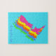 Quebra-cabeça da Nova Zelândia em cores vibrantes, brilhantes e fluorescentes azuis, amarelas, cor-de-rosa, verdes e amarelas. Este quebra-cabeça de Kiwi tem espaço na parte inferior para adicionar seu próprio texto. Isso seria um presente maravilhoso!