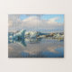 Quebra-cabeça de serra de vaivém da reflexão das nuvens e dos iceberg em Jokulsarlon, lago da geleira em Islândia, aonde os iceberg que desmoronam da geleira de Breidamerkurjokull flutuam ao redor.