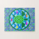Uma tartaruga de mar verde com escudo modelado, contra uma água azul/teste padrão de onda, com diversos peixes coloridos. Design circular com uma beira verde. Tartaruga de mar art.