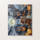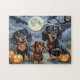 Libere o espírito assustador com esta design sombria do Dia das Bruxas apresentando um bando de cachorros sob um céu escuro e iluminado, cercado por morcegos voadores e abóboras brilhantes. Perfeito para aqueles que amam um toque de diversão terrível com seus amigos peludos!