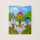 Este quebra-cabeça comemora as alegrias da fé, da família & dos amigos com casas do pássaro e de passarinhos dourados em um birdbath em um jardim de rosas.
