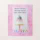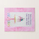 Um quebra-cabeça com um bolo de aniversário de unicórnio feminino em um felpudo cor-de-rosa macio. Personalize para a aniversariante!