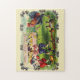 Quebra-cabeça mostrando o coelho da Páscoa, um galo, e pequenos pintinhos jogando beisebol no dia da Páscoa.