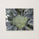 Esta quebra-cabeça espetacular mostra uma fotografia detalhada de uma cabeça de brócolis crescendo em um jardim. Os floretes verdes fortemente recheados estão rodeados pelas grandes folhas exteriores do vegetal.