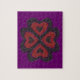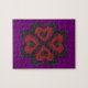 Este quebra-cabeça impressionante caracteriza uma imagem digital bonita de um coração preto e vermelho gótico com bordas ásperas que brilham com uma luz etéreo e parecem derreter. O fundo é roxo.