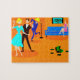 Este Quebra-cabeça do Retro Cartoon do Partido dos Cocktail Jigsaw não tem um osso introvertido no corpo! O design moderno do meio século apresenta um desenho animado de uma sala de estar e um coquetel animado. Há um casal atraente na pista de dança. A loira de um vestido de turquesa e sua escolta alta, escura e bonito estão dançando o cha-cha. No chão, há um gravador verde rodeado de discos de vinil. Contra a parede oposta, uma linda ruiva está sentada num sofá azul. Ela está vestindo um vestido rosa brilhante. O único acessório dela é o vidro martini na mão. Ao lado dela está uma lâmpada do chão, menos a sombra. Onde está a sombra? Está na cabeça de um homem tonto de terno azul que é claramente a vida da festa. Ele também está segurando um copo de martini. Quem decorou o quarto não tinha medo de cor. Tem uma parede de tijolos laranja e um piso laranja. Na parede atrás do sofá, há uma pintura de um globo com uma estrutura preta e turquesa.