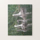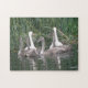Esta quebra-cabeça espetacular mostra uma bela fotografia de um par de cisnes adultos e dos seus 4 ciganos a nadar à distância ao longo de um calmo rio pacífico.