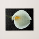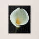 Um belo e desafiador quebra-cabeça de lírio mostrando uma flor de lírio branca em um fundo preto.