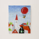 Quebra-cabeça de Mouse e Telhados com Mouse flutuando em seu balão de ar quente acima dos telhados de uma cidade.
