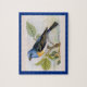 Quebra-cabeça (de vários tamanhos) com a ave-mãe de Lázuli em azul, amarelo, preto e branco sobre fundo colorido de folhas e galhos verdes. Parece uma imagem de audubon.