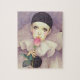 quebra-cabeça de quebra-cabeça de 8" x 10" com uma imagem antiga do palhaço triste Pierrot, de 1980, com uma lágrima no olho e uma rosa na mão de longa data. Pierrot é um personagem que evoluiu na aparência com romântico, decadente, simbolista e início do Teatro e Arte Modernista. Essa imagem é a imagem popular de Pierrot nos anos 1980. Veja toda a coleção de Quebra-cabeça Tubular 80s nas ATIVIDADES | Seção Quebra-cabeça.
