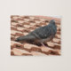 Esta quebra-cabeça espetacular mostra uma fotografia de um pombo selvagem sentado sobre um telhado. O pombo tem uma bela plumagem moscada e parece muito contente sobre seu poço de telhado.