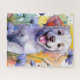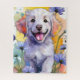 Uma imagem de arte digital de um filhote alegre de um recuperador de ouros com uma língua cor-de-rosa para fora, rodeada por flores azuis vibrantes e salpicos coloridos de tinta. A expressão do cão irradia a felicidade e a brincadeira no meio do vivo contexto artístico.